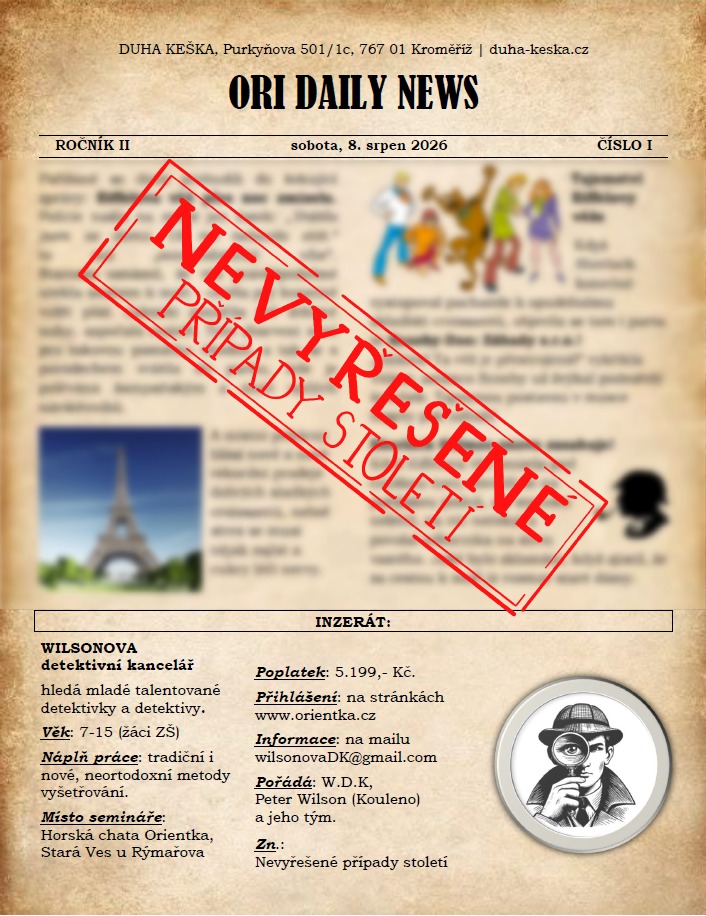 Tradiční systémové agentury selhaly. Stále existují NEVYŘEŠENÉ PŘÍPADY STOLETÍ. Wilsonova detektivní kancelář hledá mladé detektivy a detektivky, kteří by se chtěli naučit standardní, ale i neortodoxní metody vyšetřování záhad – šifry, odlévání stop, mapování okolí, stíhání pachatelů, forenzní techniky aj. Bude však i čas na zdokonalení fyzičky při sportovních aktivitách. Součástí výcviku je i velká výprava do okolí a dobrodružné přespání pod širým nebem.